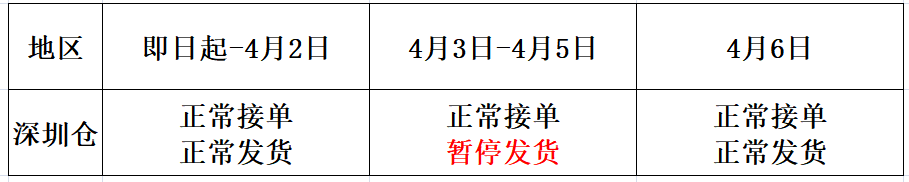 1、深圳仓4月2日及之前的现货订单正常发货,4月3日- 4月5日的订单将于4月6日发货。