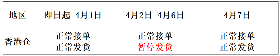 2、香港仓4月1日及之前的现货订单正常发货,4月2日- 4月6日的订单将于4月7日发货。