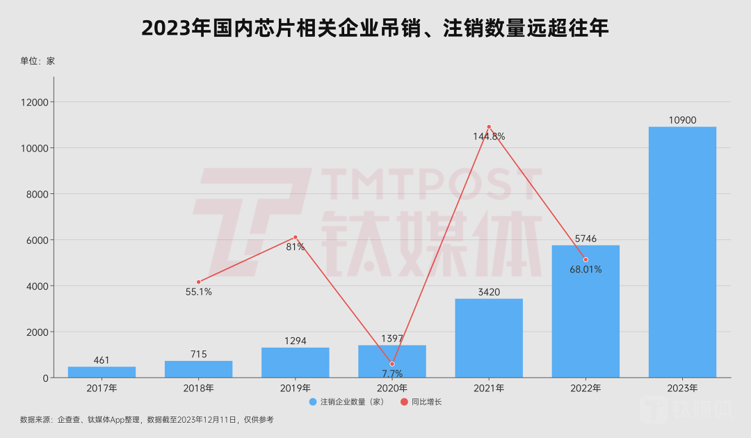 “据钛媒体报道,截至2023年12月11日,中国已有1.09万家芯片相关企业工商注销、吊销,同比增加69.8%,较2022年的5746家增长89.7%。”