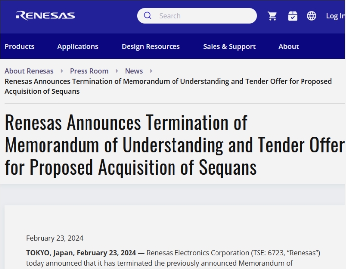 “2月23日,日本半导体大厂瑞萨电子(Renesas Electronics)在其官方网站宣布取消对法国半导体企业Sequans Communications所提出的收购案、中止对Sequans实施的TOB(股票公开买卖)。”