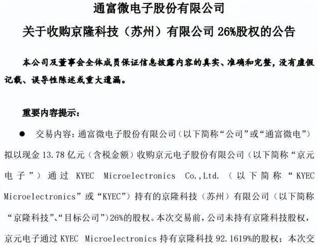 根据公告,通富微电拟以现金13.78亿元(含税金额)收购京元电通过KYEC Microelectronics Co.,Ltd.持有的京隆科技26%的股权。