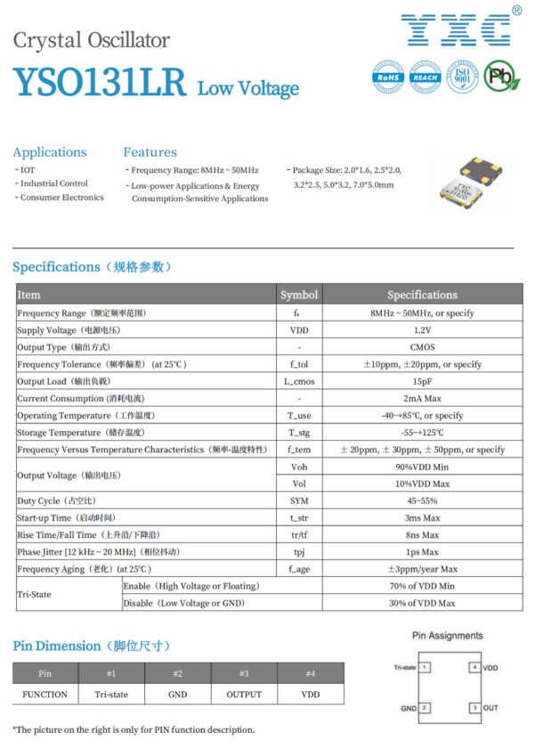 随着科技的飞速发展,低功耗、高效率、高可靠的电子元器件已经成为市场的焦点。尤其是在物联网(IoT)、可穿戴设备和便携式设备等领域,对延长电池寿命的需求日益迫切。为应对这一趋势,YXC扬兴科技推出了低电压1.2V单端振荡器YSO131LR系列,为上述新兴应用提供高效、超低功耗的时钟解决方案。