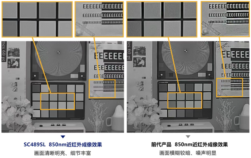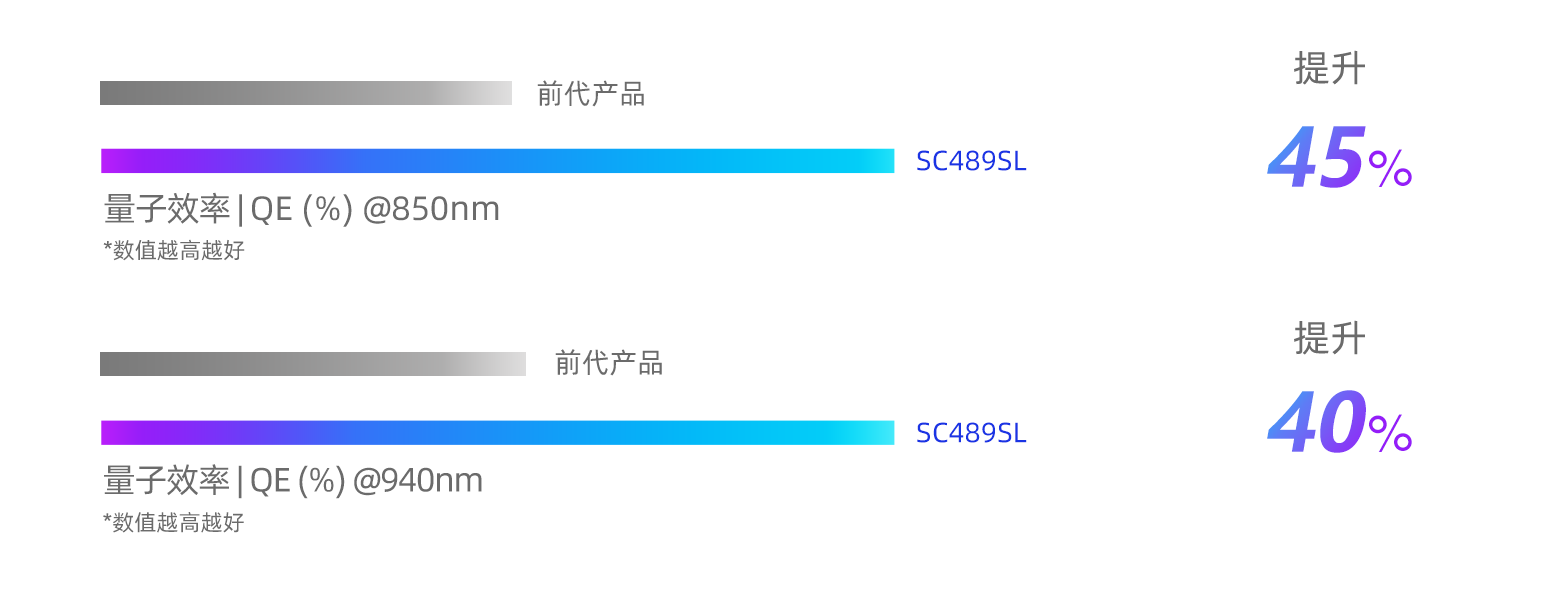 作为首款搭载该技术的背照式高性能产品,与前代产品相比,SC489SL在850nm波段和940nm波段下的峰值量子效率(peak QE)分别提升约45%和40%,能够帮助摄像头有效扩大在双红外补光灯下的可视范围,实现120米的夜间超远距离清晰成像,从而为安防监控的户外夜间远距离拍摄等提供可靠支持。