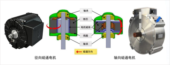 与常见的径向磁通电机相比,轴向磁通电机定转子平行布置并垂直于转轴,转子主要由永磁体材料构成,定子铁芯由硅钢片叠压而成,定子绕组常以印制或绕线的方式制作而成,绕组面积较大,便于散热。更为关键的是,由于轴向磁通电机磁通路径(从转子上的永磁体开始,通过气隙进入定子,再返回转子,形成一个闭合回路,而径向系统电机的路径是从一个转子极延伸到第一个定子齿,然后穿过定子轭部到第二个齿,最终返回另一个转子极,形成一个较长的路径)更短,单位体积内的磁能利用率更高,因此在相同体积下能输出更大的功率,而且轴向磁通电机的转子直径更大,因此在相同力作用下可获得更高的转矩输出。