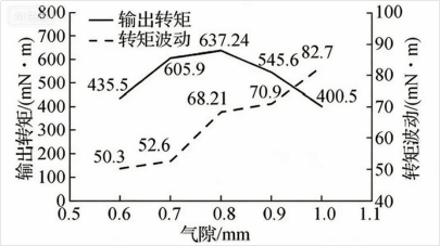 对于气隙长度,等于PCB定子的绕组盘厚度与2倍的定子绕组和转子盘体之间的单边气隙长度之和。若气隙较大,转矩输出反而会下降且加剧转矩波动(如图四),还会增加电机体积并且需要使用更多的永磁体材料从而提高了成本。若过低,定子可能会和转子之间有物理接触。而一旦气隙长度确定后,就可以确定磁钢的厚度,一般磁钢厚度与气隙长度比值为1.2~1.6之间为宜。
