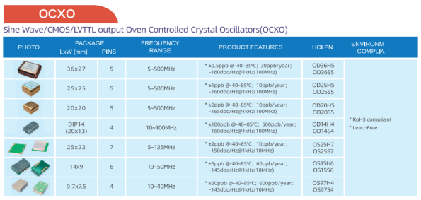 OCXO恒温晶体振荡器是将石英晶片放于恒温槽内,让晶片温度基本维持恒定的晶体振荡器,常选用高精度SC切型与低成本AT切型石英晶片制造振子。该系列产品频率稳定性可达10??量级,老化率与相位噪声极低,短稳、抗震及加速特性突出,被大量用于通讯基站、微波雷达、精密仪器、遥测、导航等需高精度频率的场景。可提供不同封装尺寸,有5MHz、10MHz、30MHz、100MHz等不同常见频率点,并支持2E/3E等定制化要求。