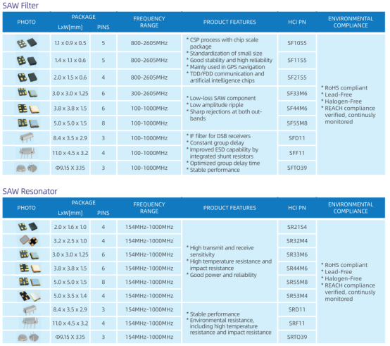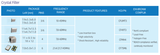 除此以外,HCI还可以提供定制滤波器系列产品(晶体滤波器、声表滤波器、陶瓷滤波器)、谐振器系列产品(声表谐振器、陶瓷谐振器)等等。