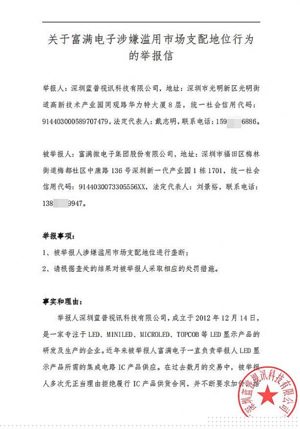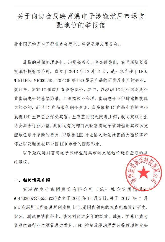 8月12日,LED电子显示屏厂商蓝普视讯在微信公众号上发布信息称,实名举报富满电子涉嫌滥用市场支配地位垄断相关芯片市场。同时,公司已经向中国光学光电子行业协会和国家市场监督管理总局反垄断局提交了《关于富满电子涉嫌滥用市场支配地位垄断相关芯片市场的举报信》。