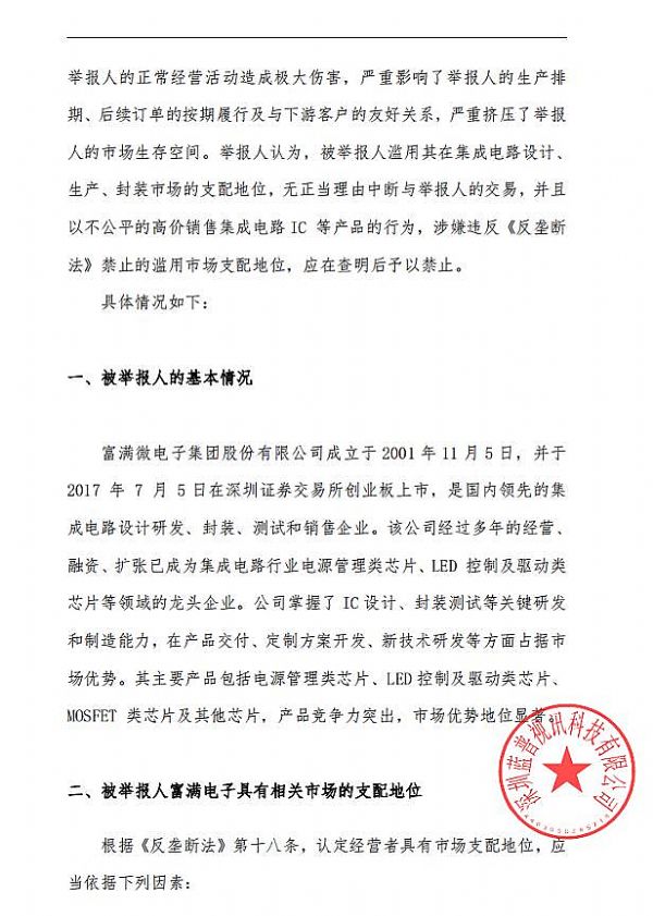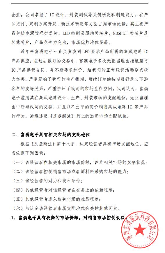 “8月12日,LED电子显示屏厂商蓝普视讯在微信公众号上发布信息称,实名举报富满电子涉嫌滥用市场支配地位垄断相关芯片市场。同时,公司已经向中国光学光电子行业协会和国家市场监督管理总局反垄断局提交了《关于富满电子涉嫌滥用市场支配地位垄断相关芯片市场的举报信》。”