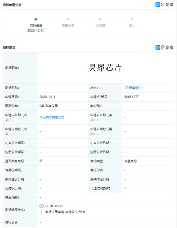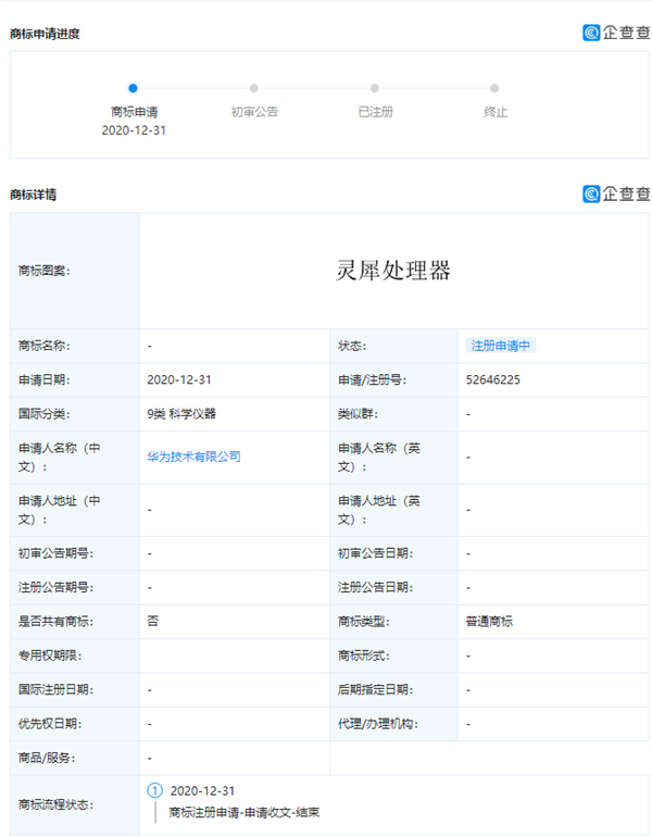 据企查查APP显示,近日,华为技术有限公司新增多条商标申请信息,其中包含“灵犀芯片”、“灵犀处理器”,国际分类涉及科学仪器,商标状态均为“注册申请中”。