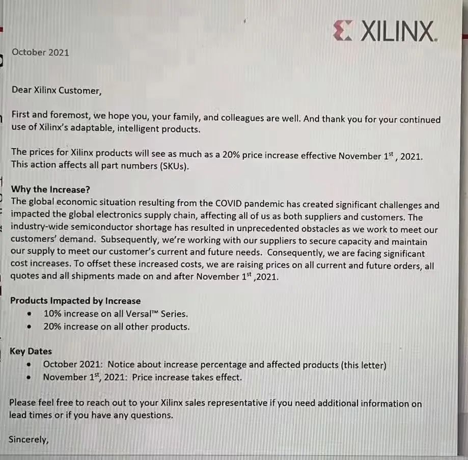 “9月27日消息,XILINX宣布涨价,所有VersalM系列上涨10%,其他产品上涨20%,11月1日生效。”